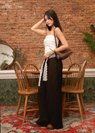 *Features a straight cut slightly wide legged fit, functional side pockets, an elastic band on the back of the pants, functional tortoiseshell button on the front with a separate lace belt for styling