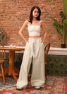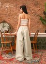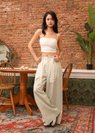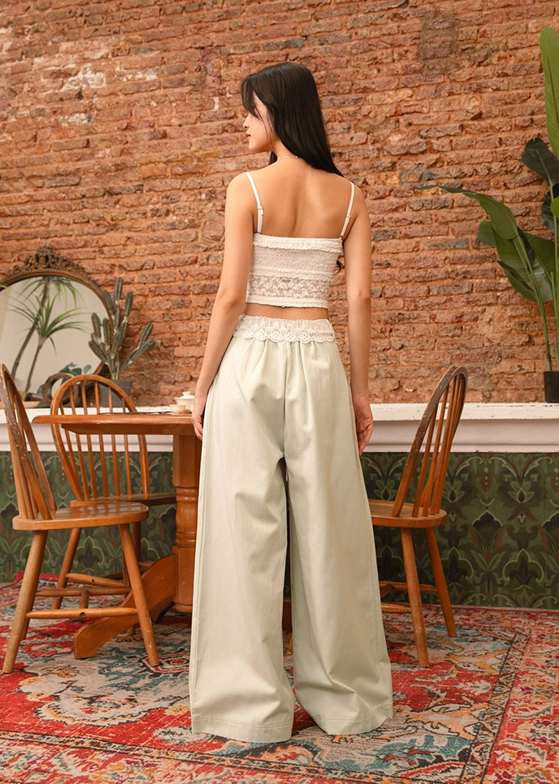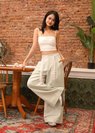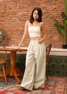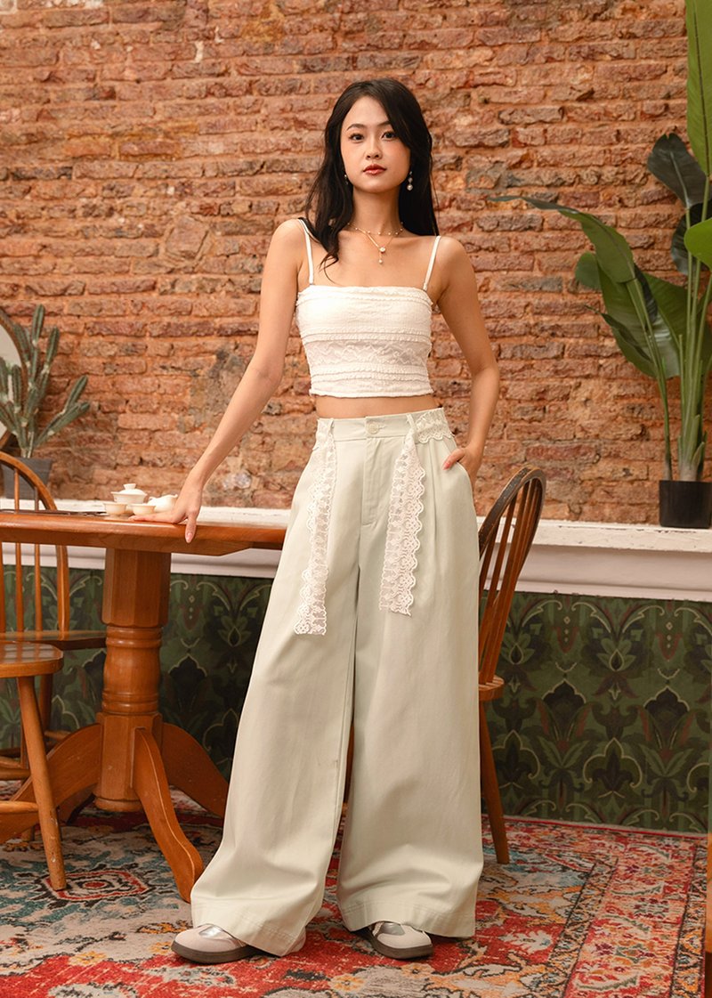 *Features a straight cut slightly wide legged fit, functional side pockets, an elastic band on the back of the pants, functional tortoiseshell button on the front with a separate lace belt for styling