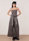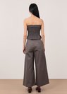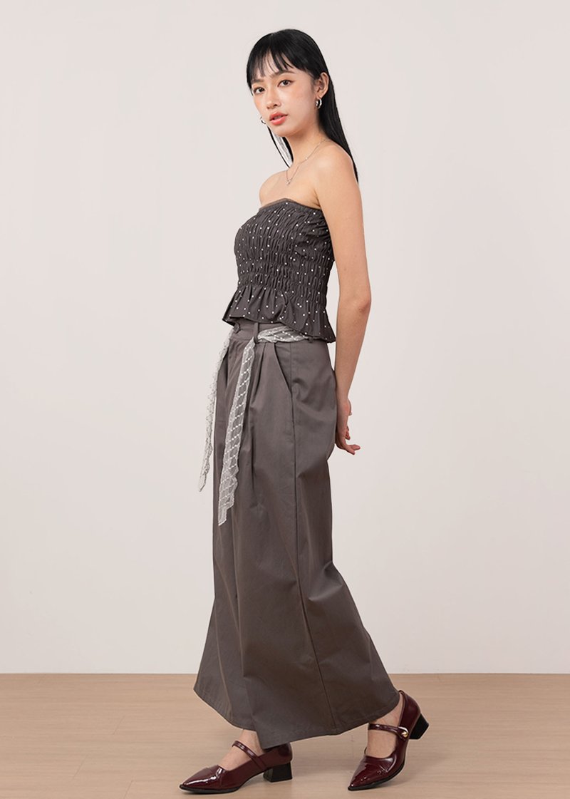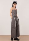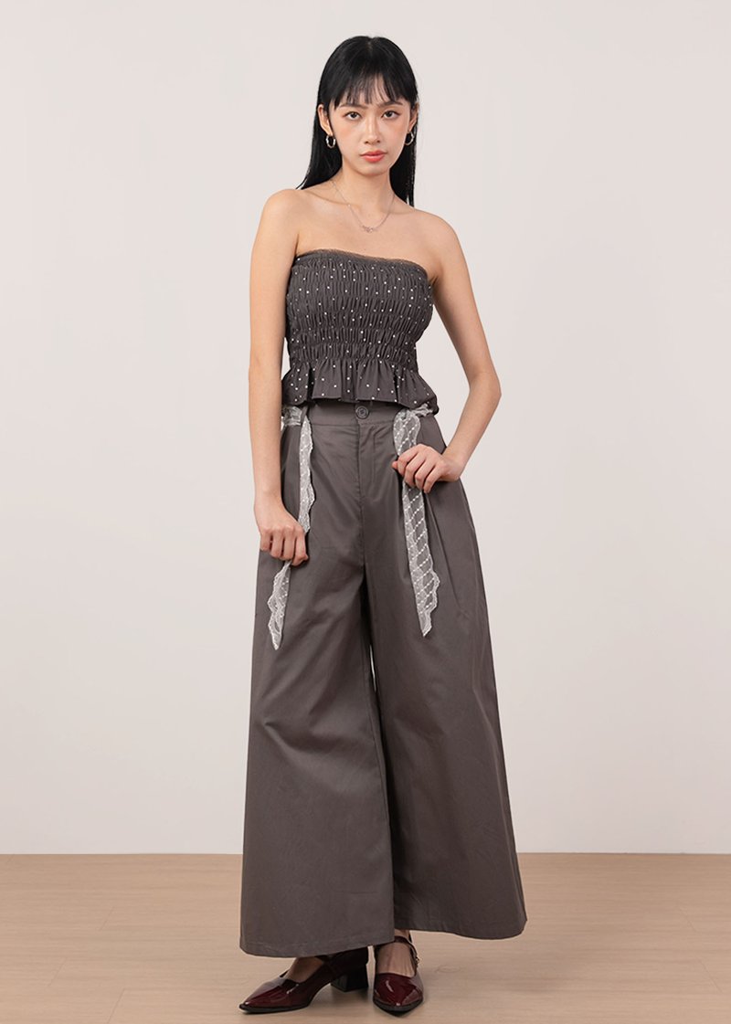 *Features a straight cut wide legged fit, functional side pockets, and tortoiseshell button in front with a separate lace belt for styling