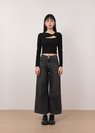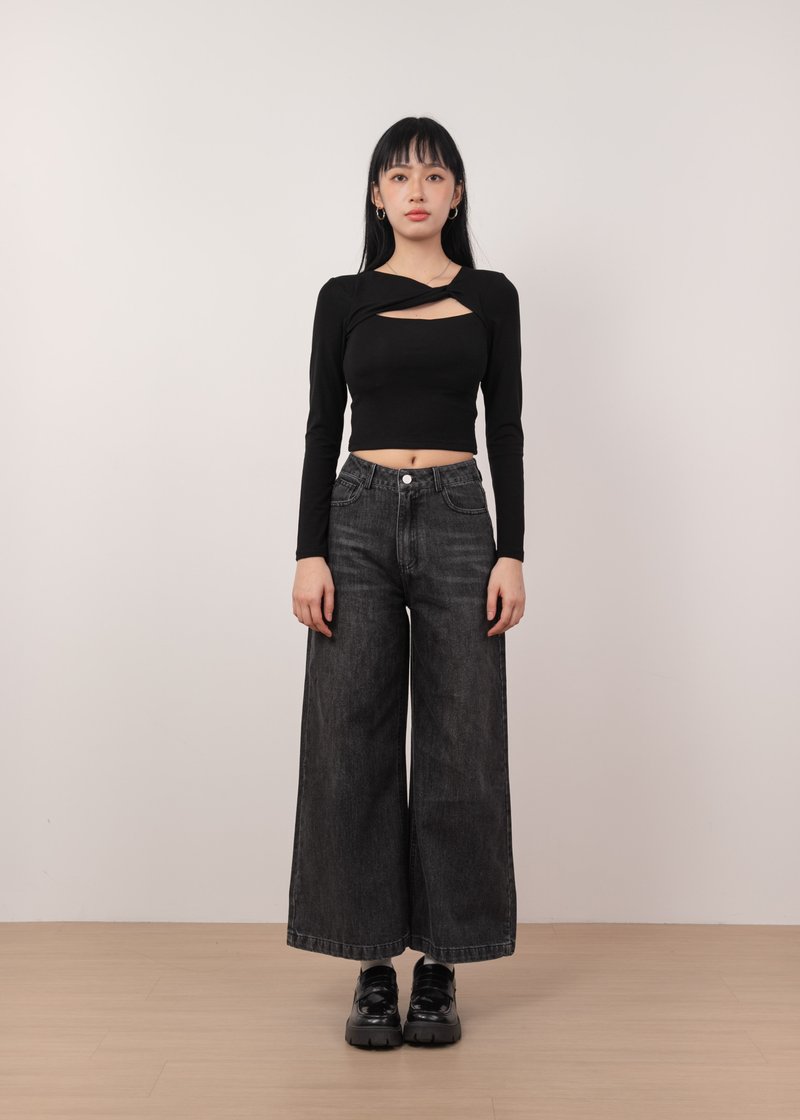 *Jeans is worn high-waisted straight cut fit with slight wide legged bell cutting