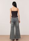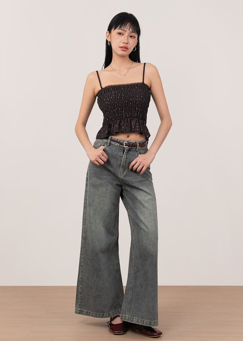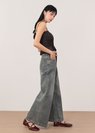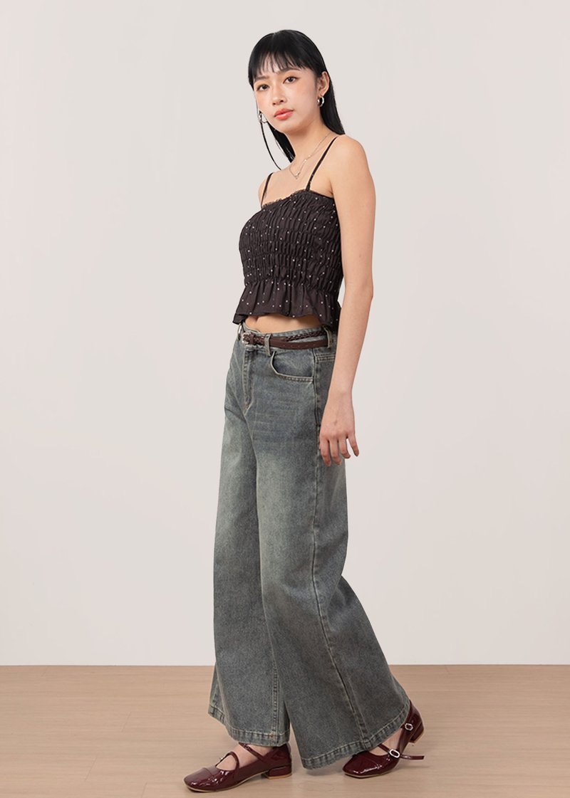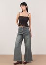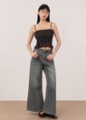 *Jeans is worn high-waisted straight cut fit with slight wide legged bell cutting