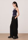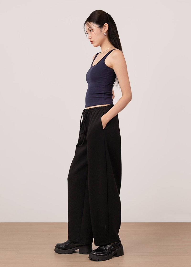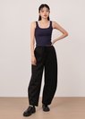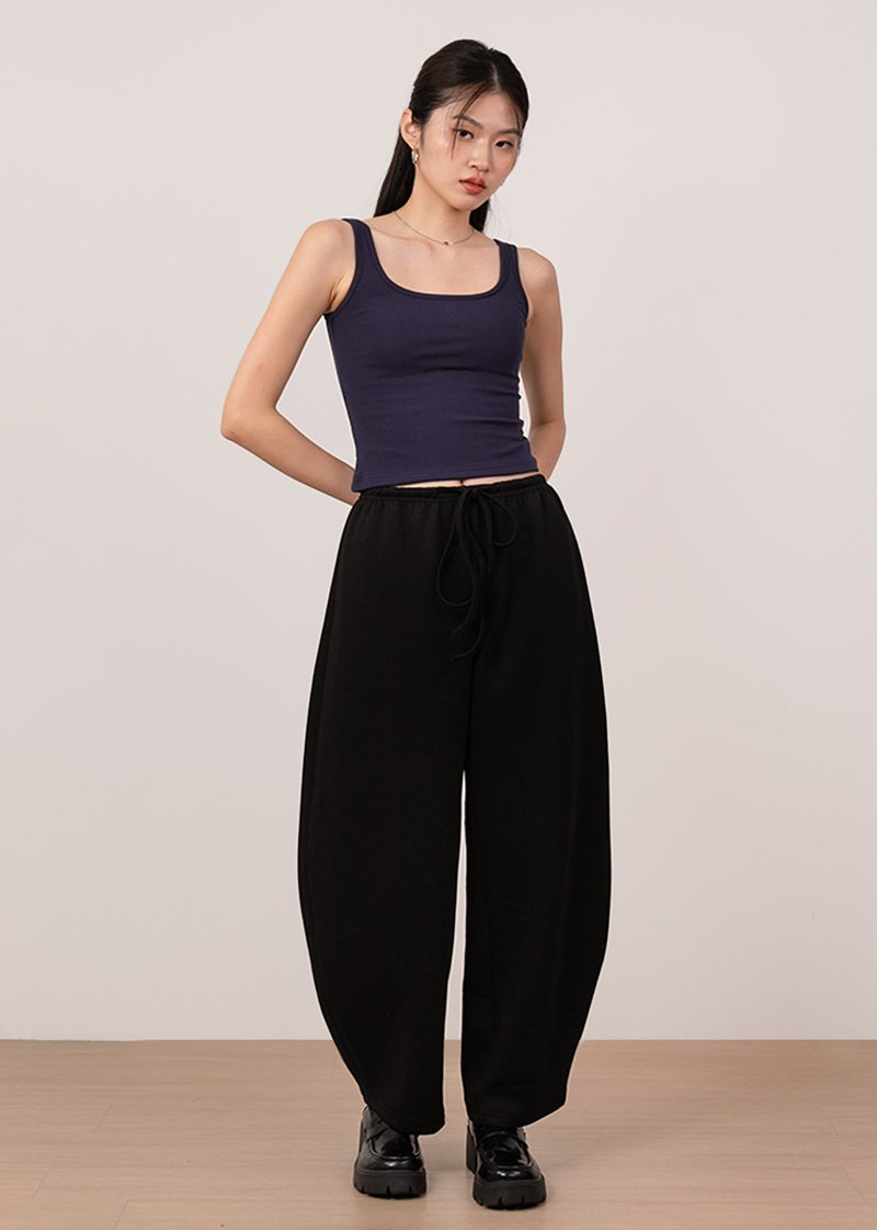 *Features a barrel cut silhouette with an elastic thin waistband, functional front tie string, and functional side pockets