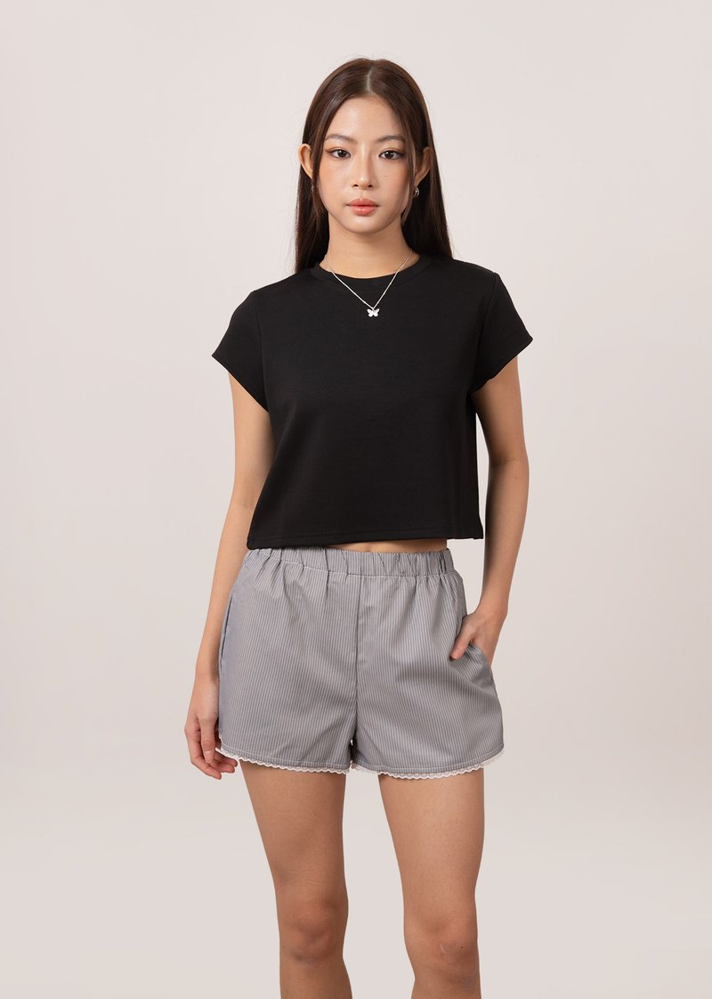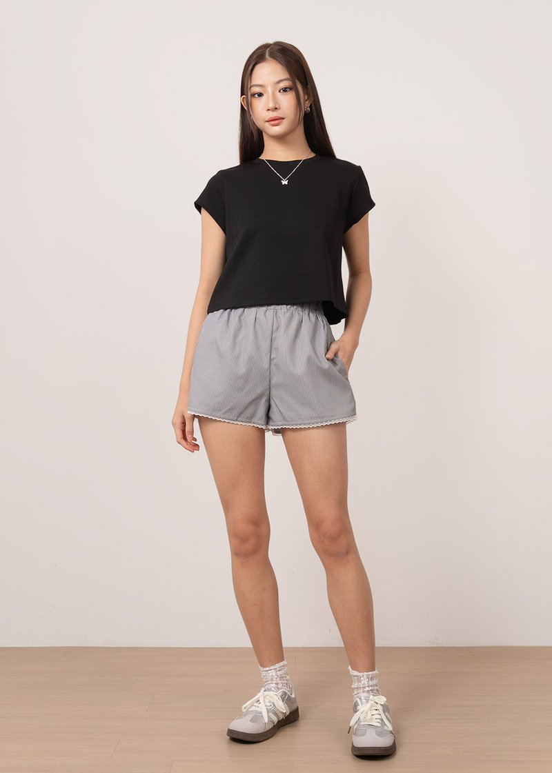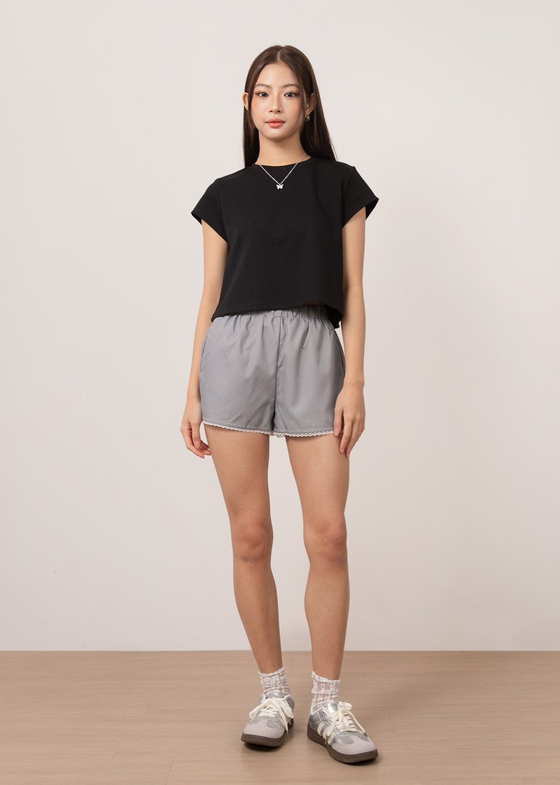 *Features an elastic band on the waist with functional side pockets and lace trimming details on the hem of the shorts