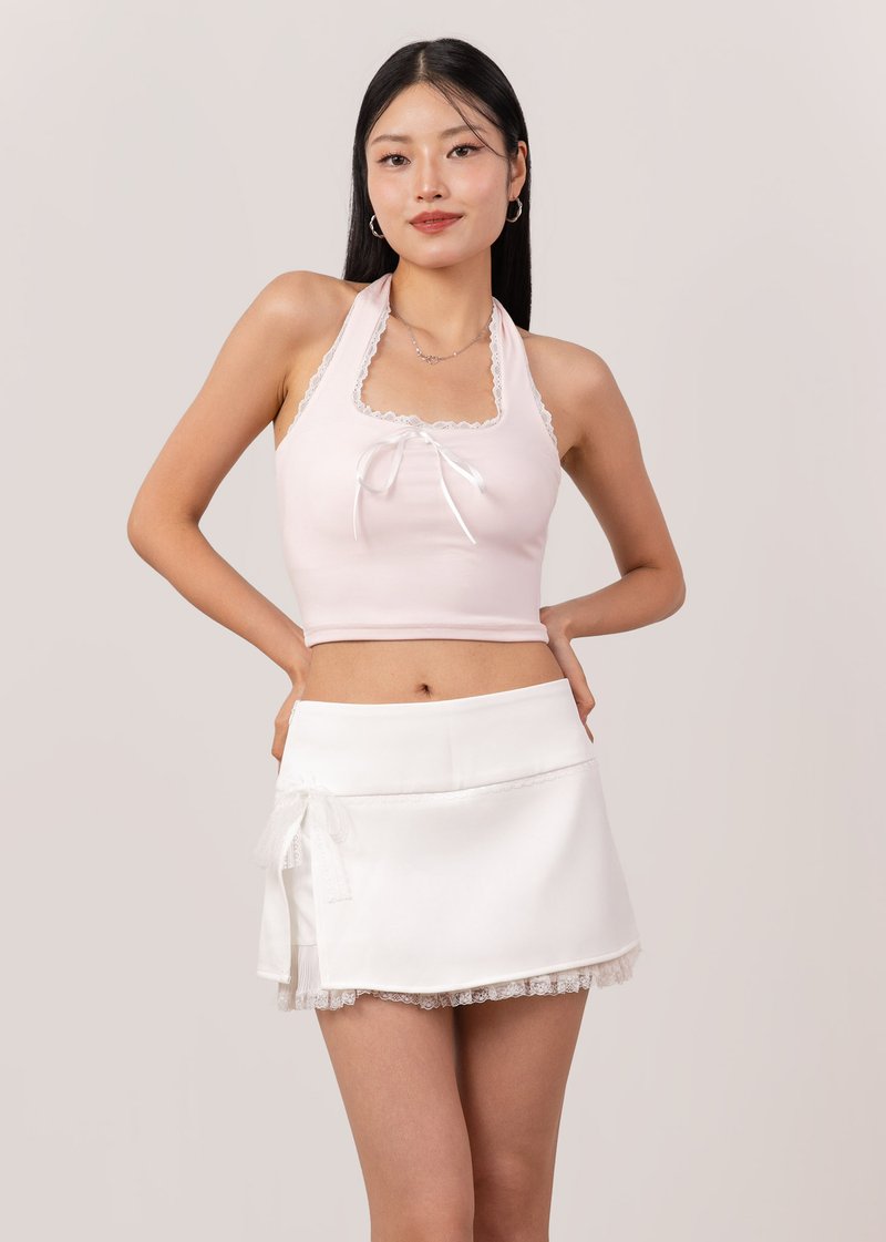 A cascade of lace pleats delicately fringe the hem, framed by a delicate lace ribbon that whispers along the side slit. Designed with precision and a hidden zipper, this mini skort unites soft femininity with confident form.Perfect for soaking up sunshine at brunch, sharing laughs on a picnic, or chasing the breeze on a bike ride.