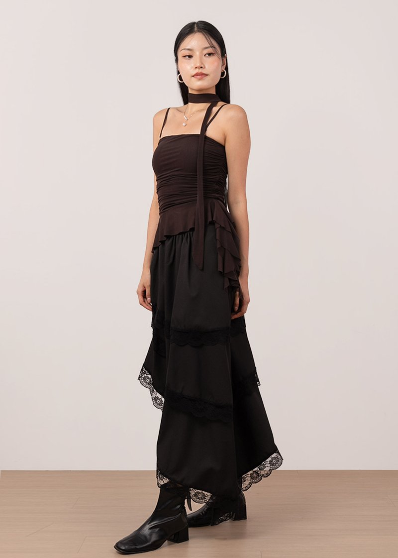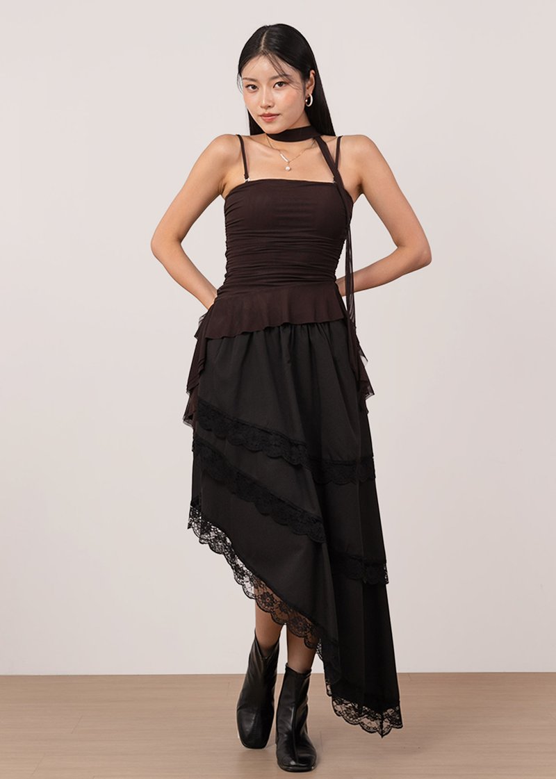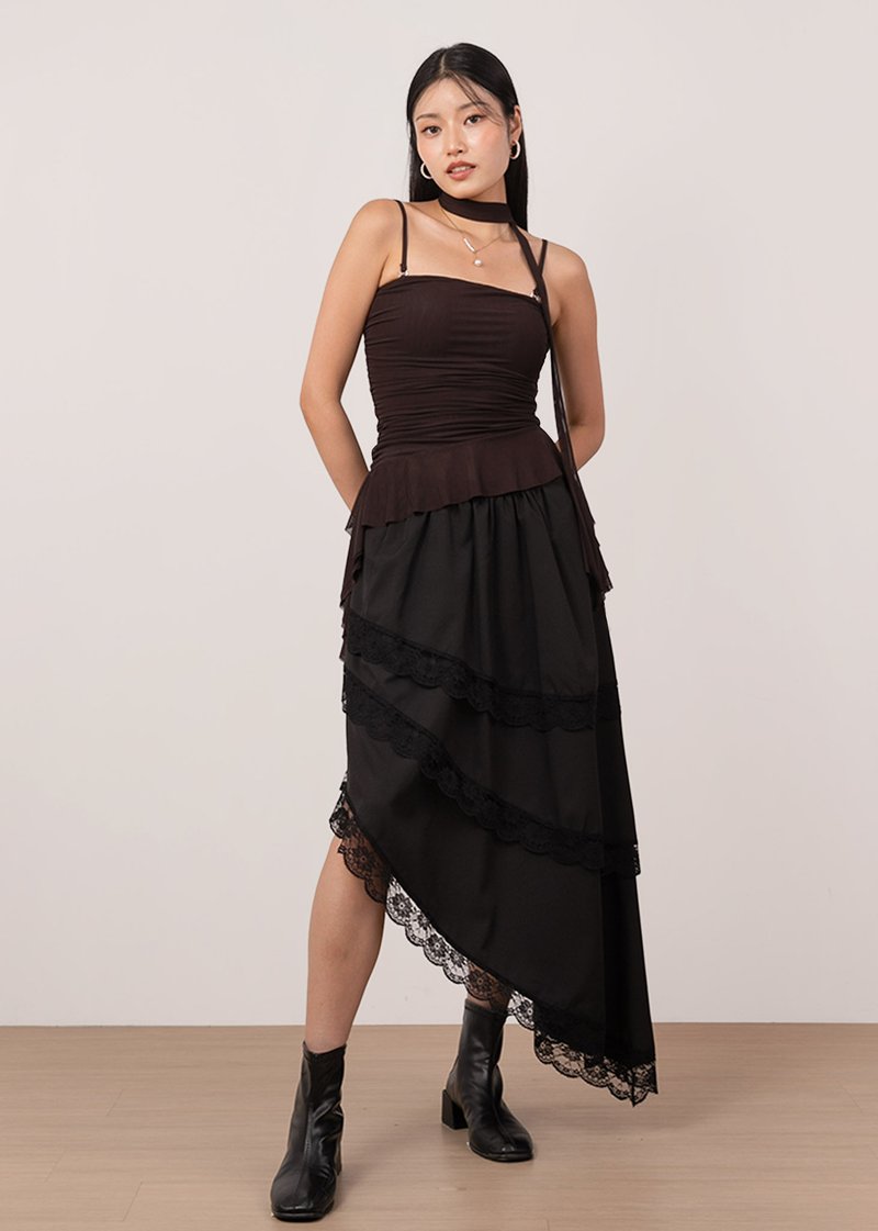 *Features a layered asymmetrical design with lacing details, elastic waistband at the back and comes with functional side pockets