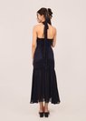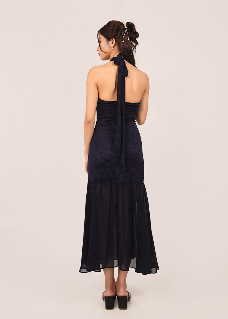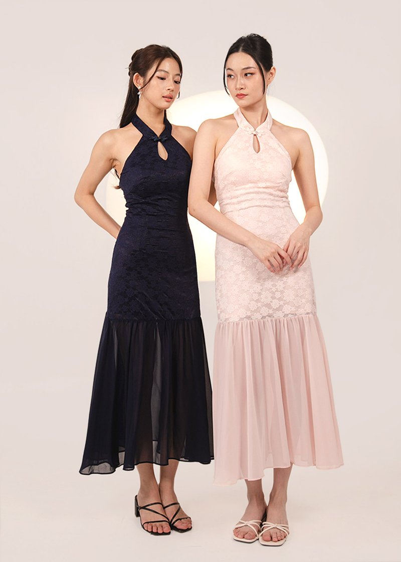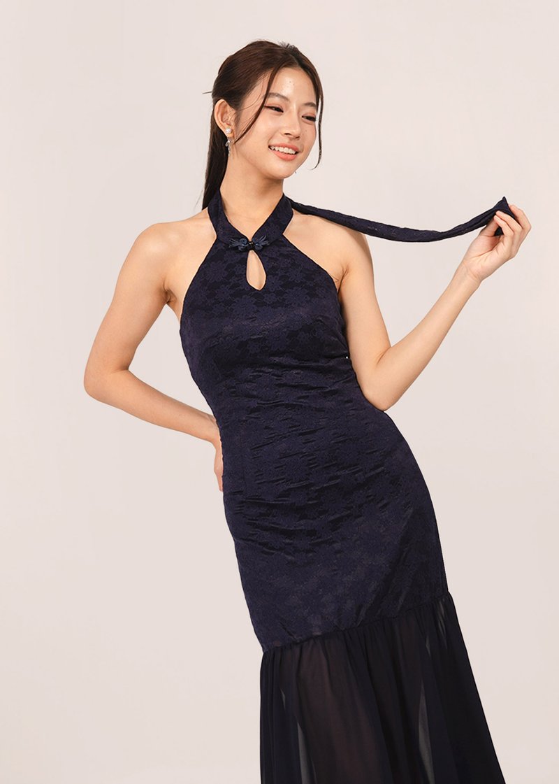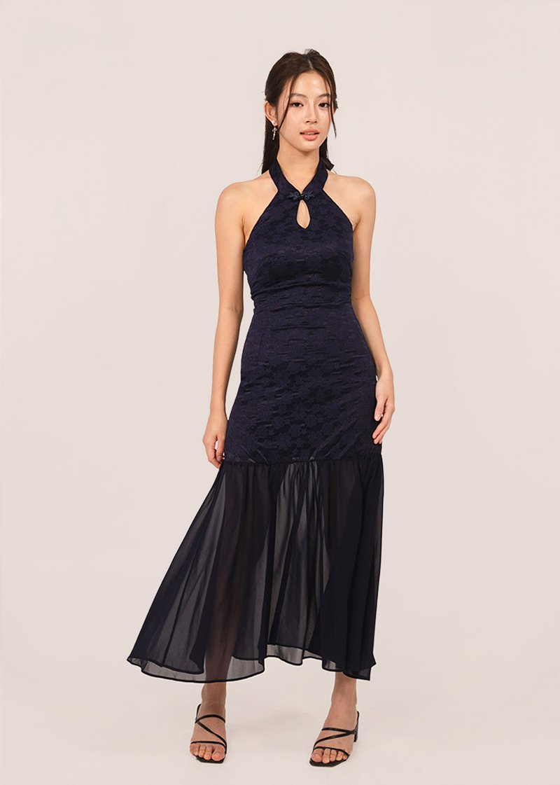 仙 (Xiān–Fairy-like purity) Dropwaist Mesh Qipao Midi Dress in Dark Navy