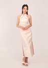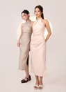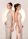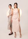 *Features a fold-in pleat detail from 2 sides of the neckline down, ruched details on the waistline, slits on both sides, and a concealed back zipper