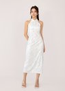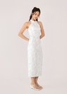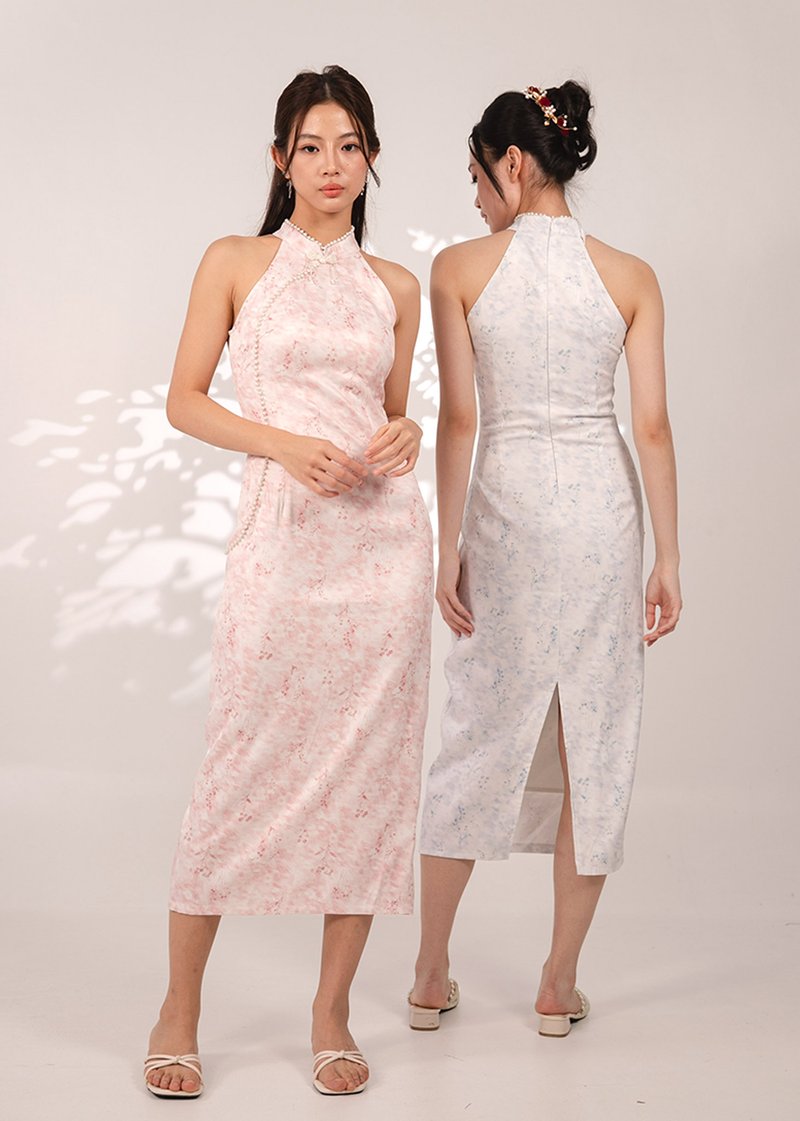 *Features a qipao neckline designed with pearl details from the neckline all the way down to the side of the qipao, a back slit, subtle floral prints throughout and a concealed back zipper
