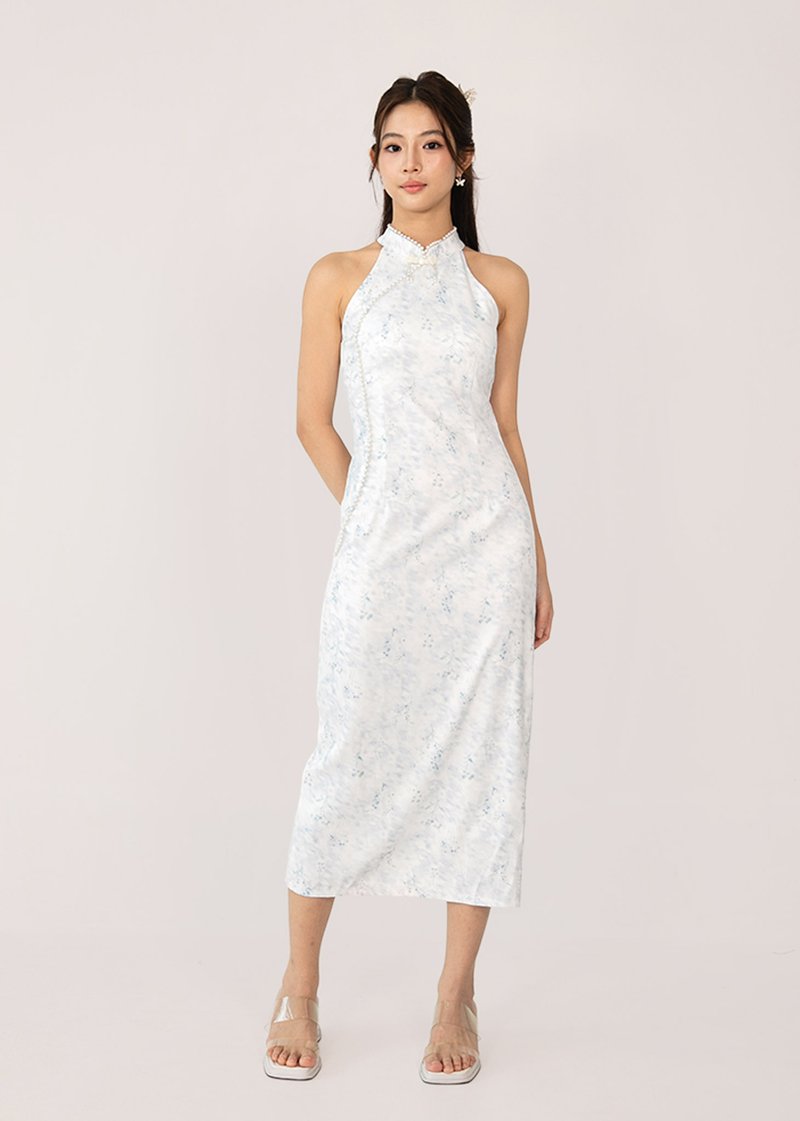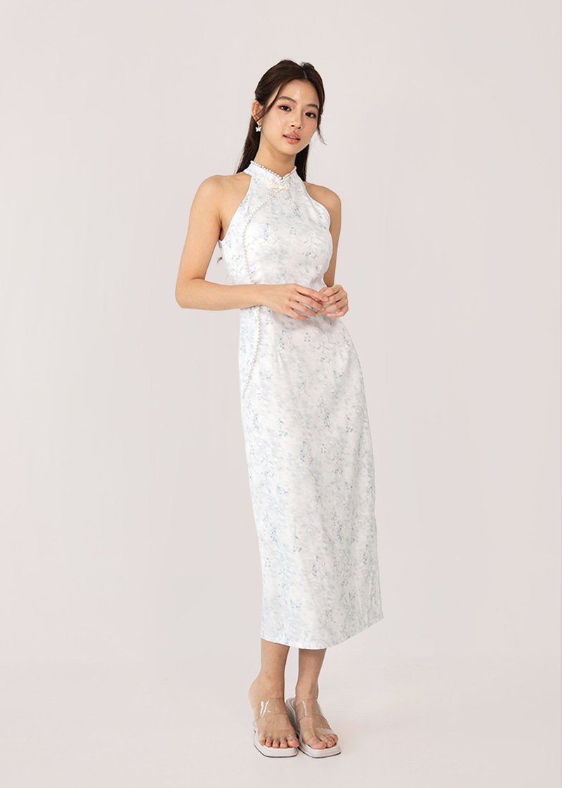 祥 (Xiáng–Harmony) Pearls Qipao Midi Dress in Whisper Blue
