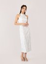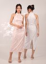 Crafted with meticulous attention to detail, 祥 (Xiáng–Harmony) is accented with pearls cascading along the neckline, subtly enhancing an elegantly sculpted form. Delicate floral prints and minimal pearl accessories create a look of quiet, elevated luxury.