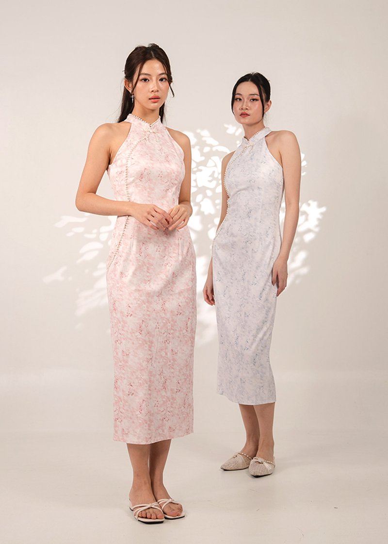 *Features a qipao neckline designed with pearl details from the neckline all the way down to the side of the qipao, a back slit, subtle floral prints throughout and a concealed back zipper