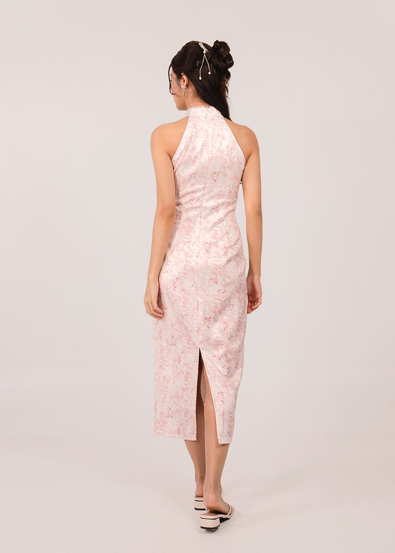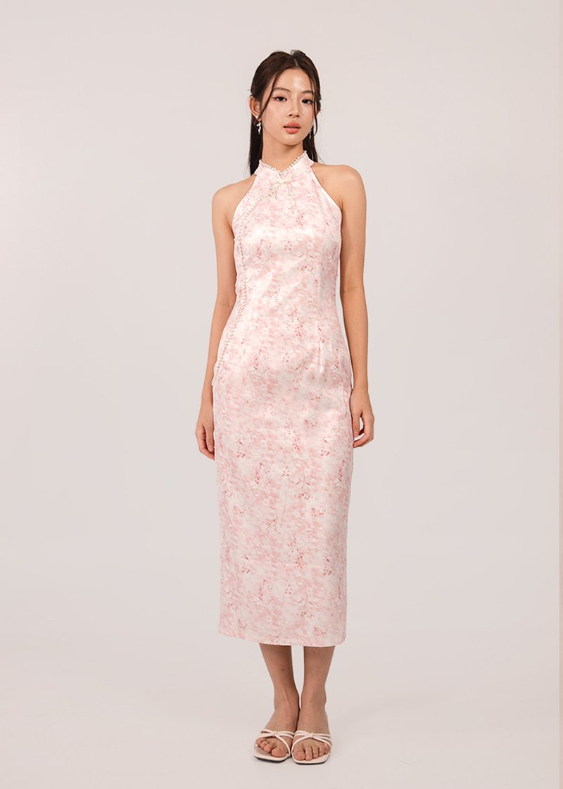 祥 (Xiáng–Harmony) Pearls Qipao Midi Dress in Whisper Pink