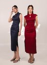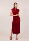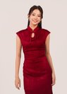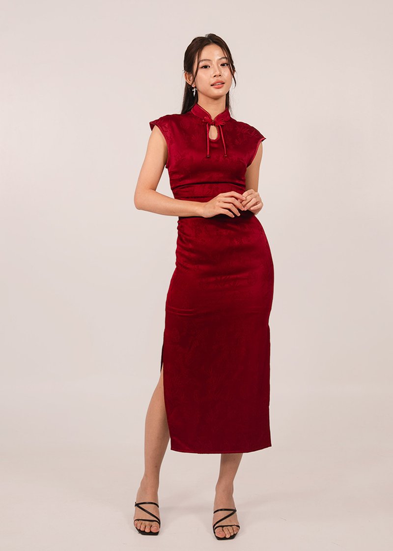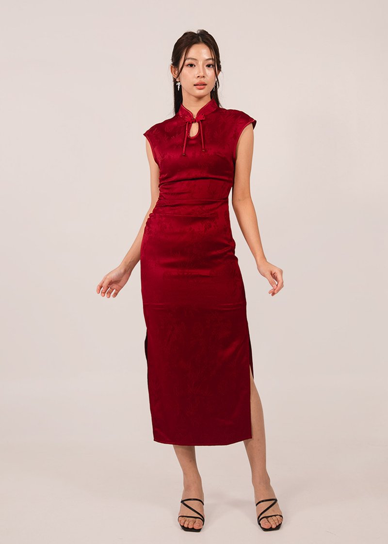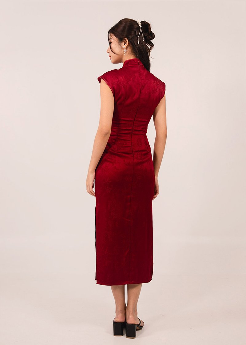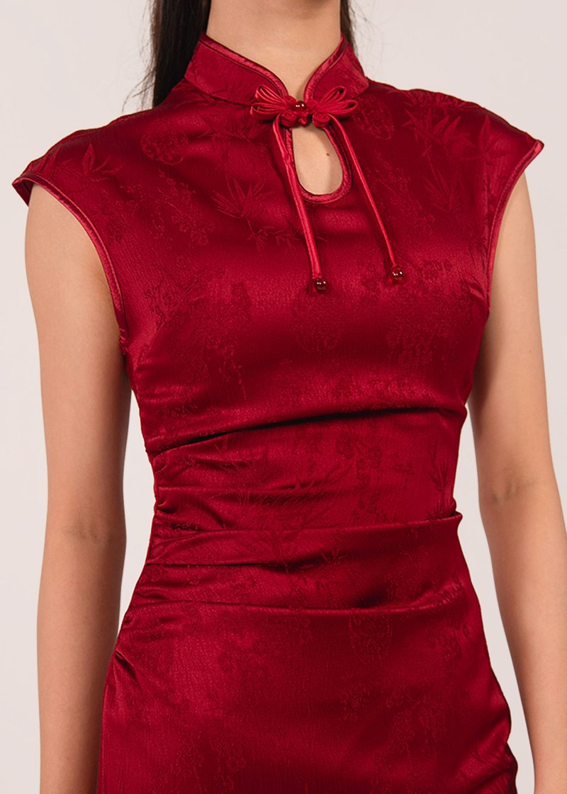 福 (Fú–Blessing) Ruched Qipao Midi Dress in Ruby Red