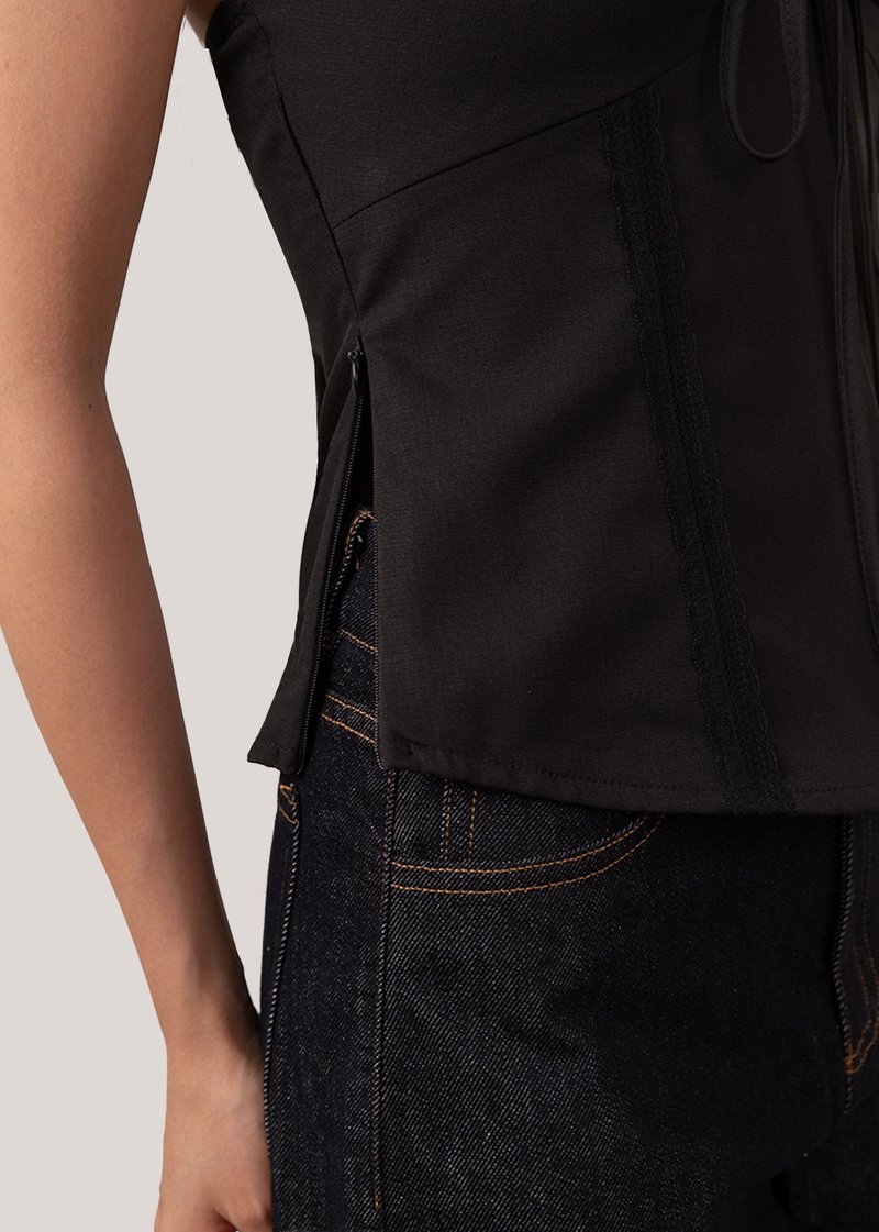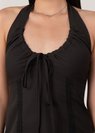 *Features a self tie halter design, a V neck line with a functional tie string in front that can be adjusted, lace details down, slight elastic band at the back and concealed side zipper
