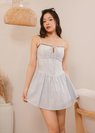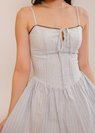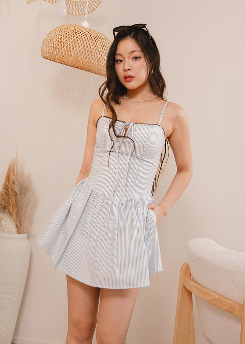 *Features a flare skater cut, functional tie string infront with lace trimmings on the bust line, a slight low back with smocked back, functional side pockets, and concealed back zipper