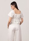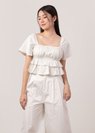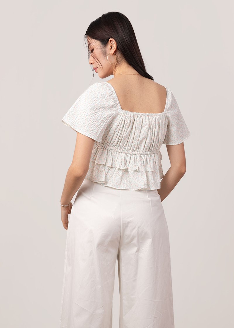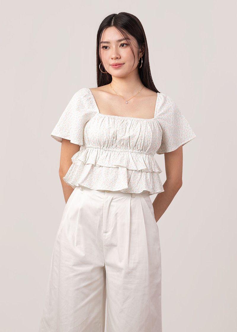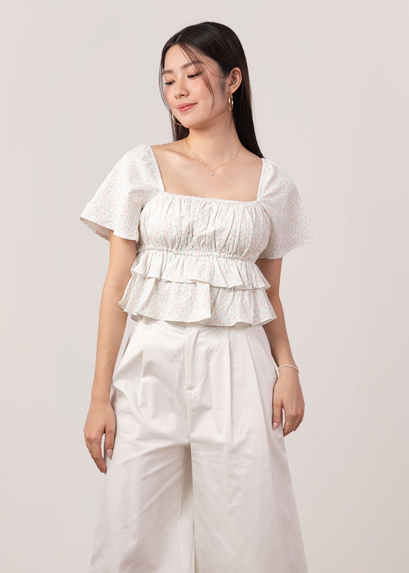 *Features flutter sleeves that can be worn on and off shoulders, elastic band at the bust line, smocked ruching throughout the top and tiered ruffles detailing down