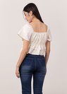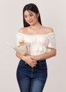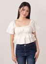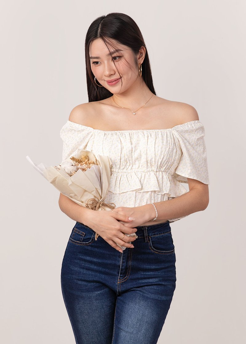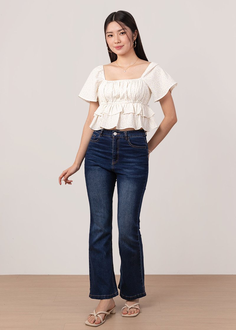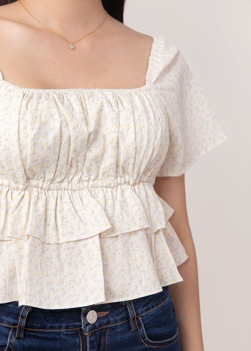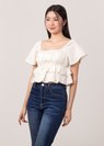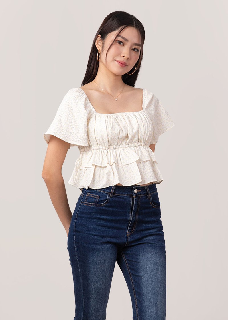 *Features flutter sleeves that can be worn on and off shoulders, elastic band at the bust line, smocked ruching throughout the top and tiered ruffles detailing down