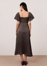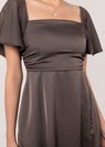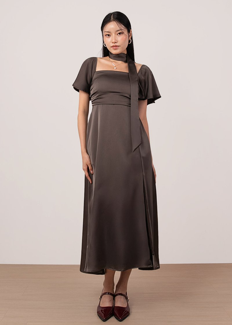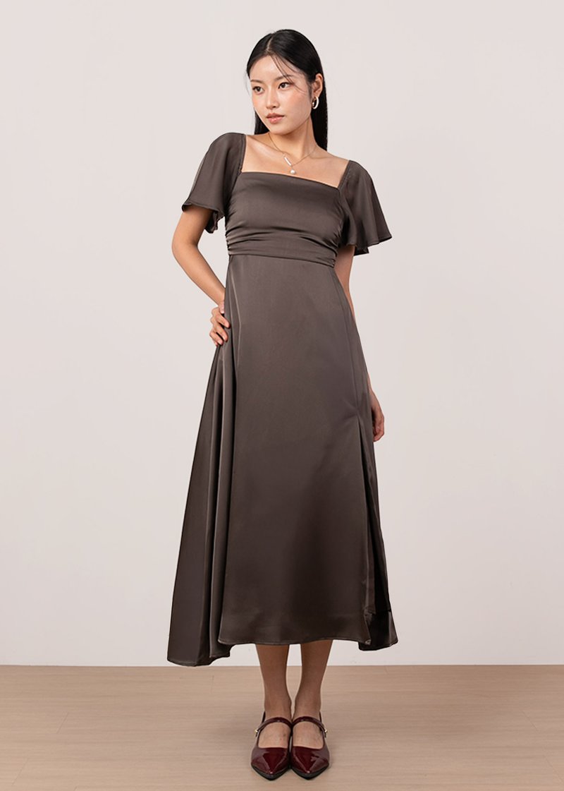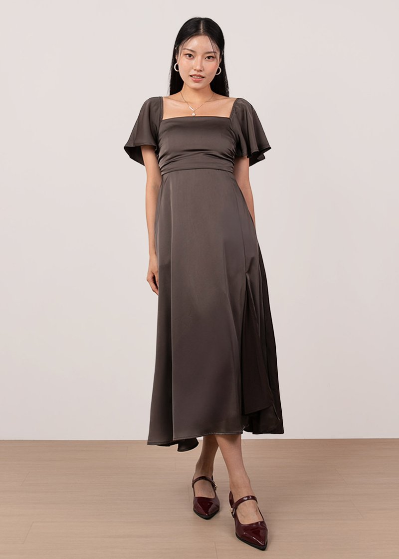 *Features a square neckline with flutter sleeves, ruched bust details, a front slit, functional side pockets, concealed back zipper and separate sash for styling