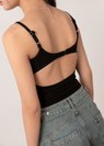 A minimal front meets a striking back. Eclipse is cut from soft ribbed fabric with a smooth lined finish, shaped with a scoop neckline and an open-back detail secured by a metal clasp, with adjustable straps and removable padding.