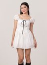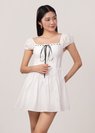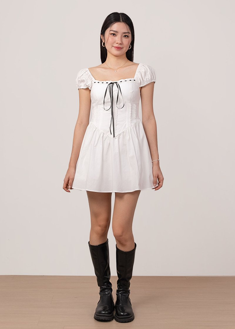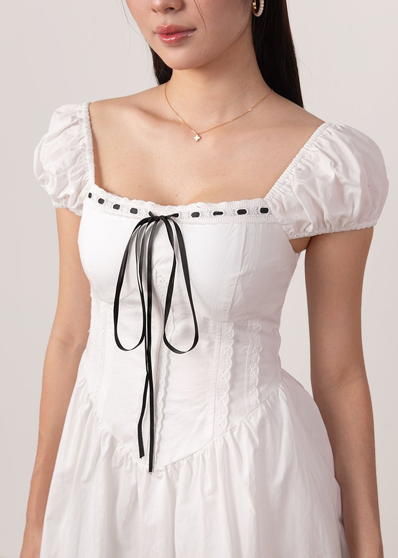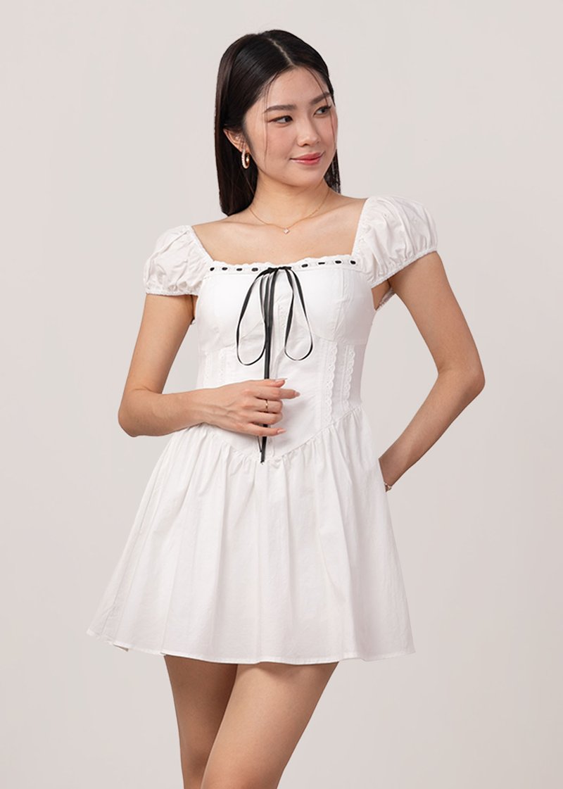 *Features a mini A line skater cut with elastic capped sleeves that can be worn on and off shoulders, a contrast ribbon details on the bust with lace trimming details on the bodice area, a concealed back zipper, functional side pockets and a smocked back