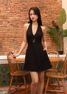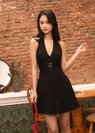 *Features a self tie halter design, a deep V neck line with two decorative metal buckle in the middle, concealed side zipper and a smocked back