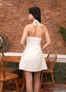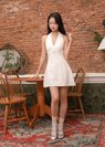 *Features a self tie halter design, a deep V neck line with two decorative metal buckle in the middle, concealed side zipper and a smocked back