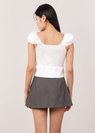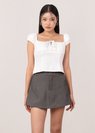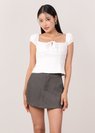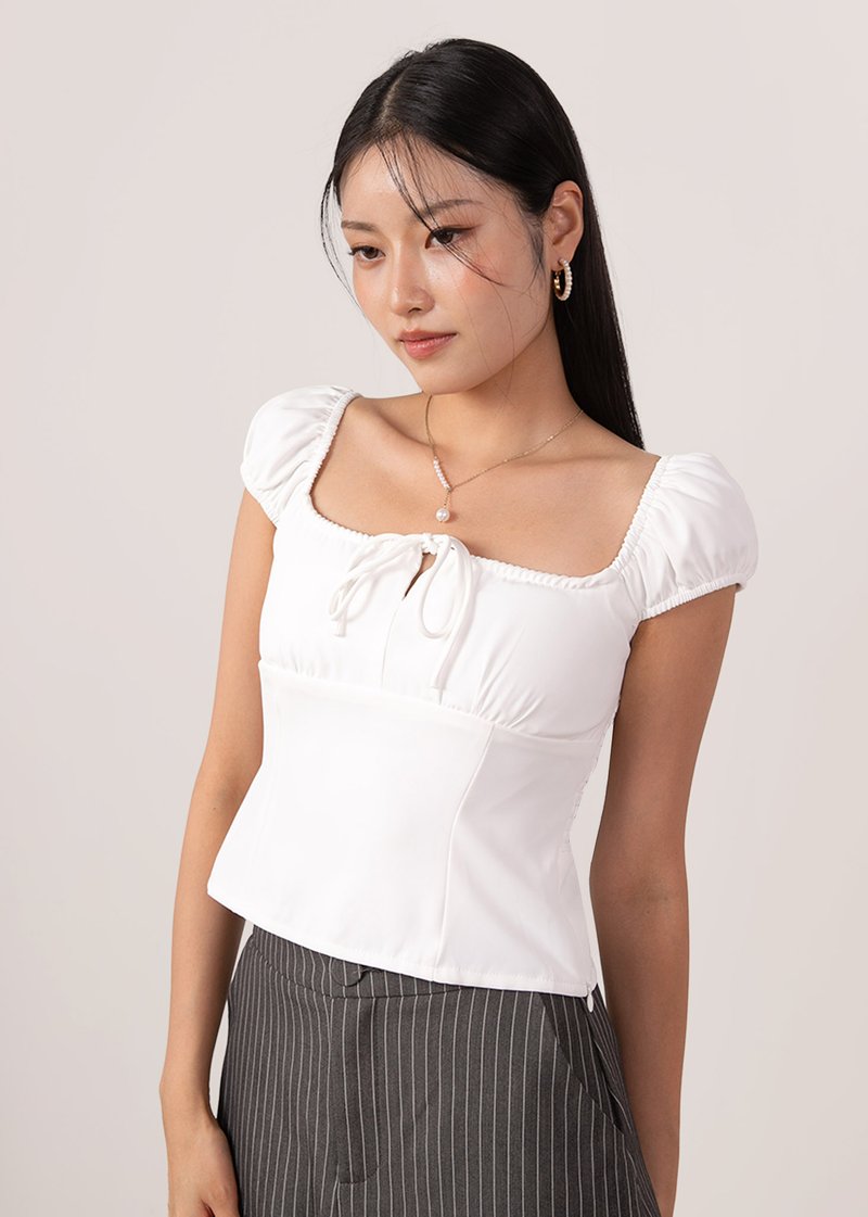 *Features a capped sleeve square neckline, functional tie string on the bust, smocked back and concealed side zipper with a separate sash for styling