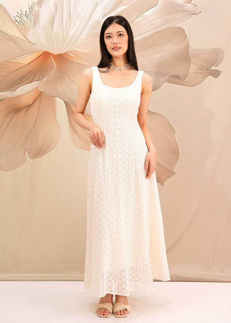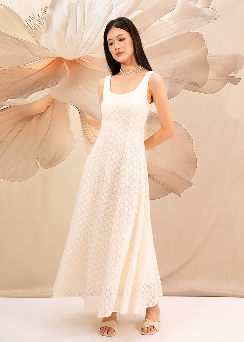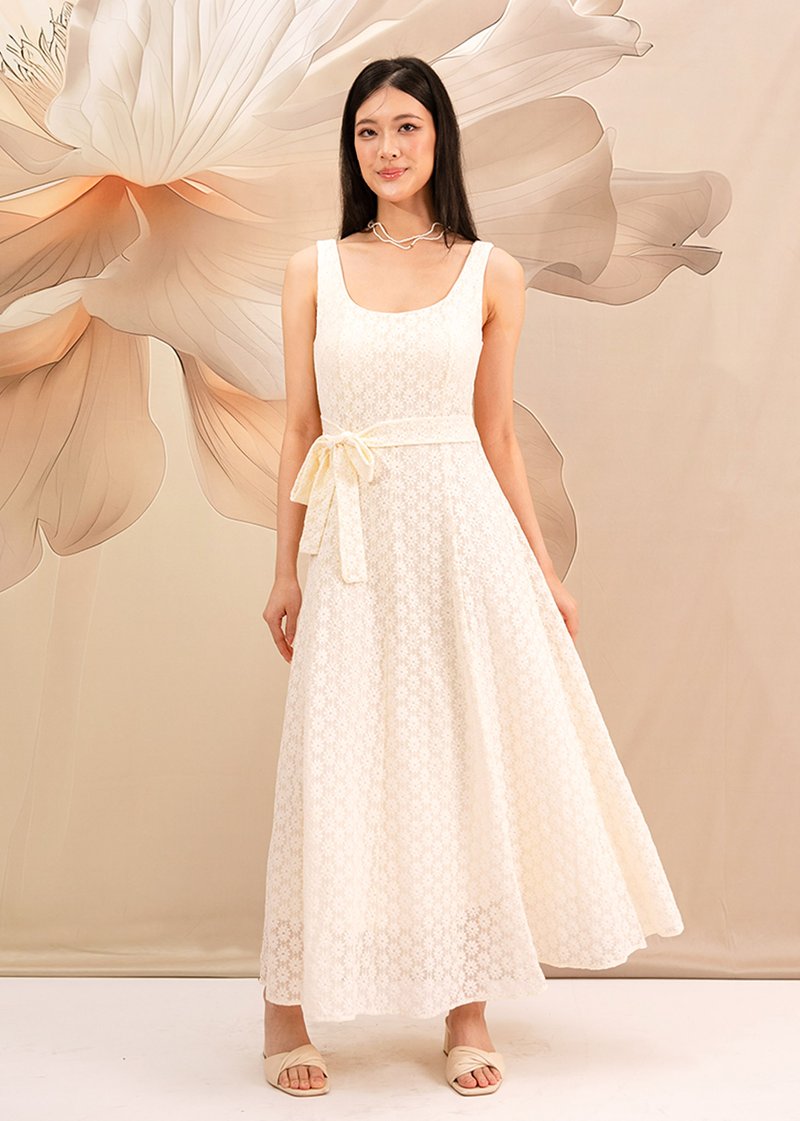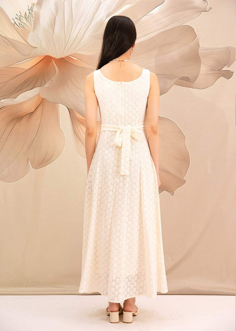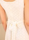 *Features a fit and flare silhouette, daisy lace details throughout, a functional tie string on the sides of the waist (to cinch in waist) and concealed back zipper