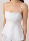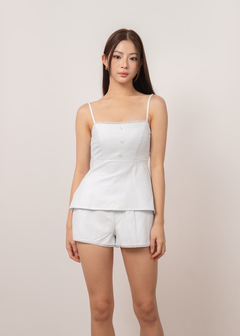 *Features straight neckline with lace trimming details, non-functional seashell buttons down, a smoked back details (stretchable up to 2 inches), adjustable straps and a concealed side zipper