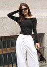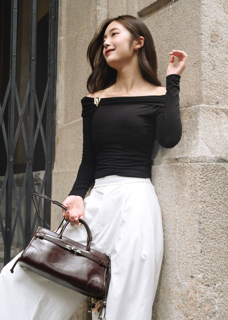 Shoulders in the spotlight, style on your terms, this ruched top bends to your mood with off-shoulder, boat neck, or side-draped flair, finished with a removable gold brooch for instant luxe. Soft, perfectly weighted fabric keeps it cozy yet polished for cooler days. Pair with skirts, pants, or jeans for a look that’s effortlessly chic.