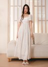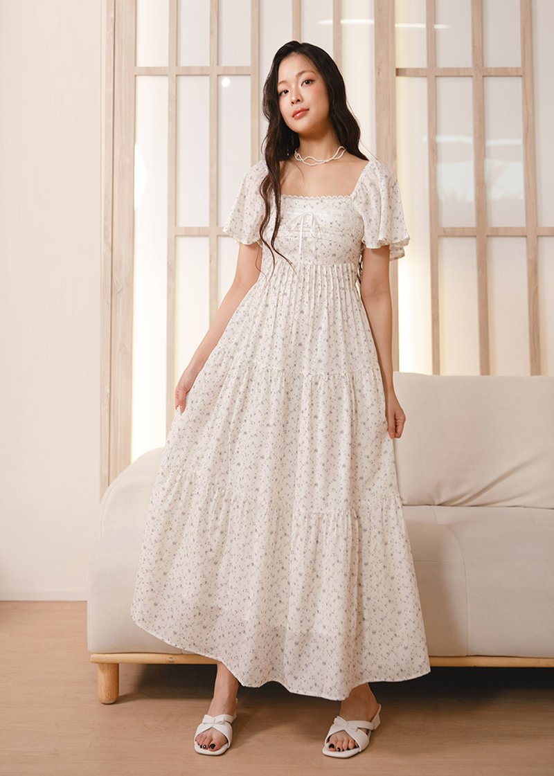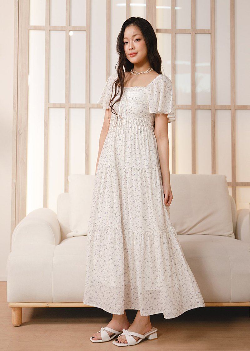 Sugarplum Flutter Sleeve Maxi Dress in White x Lavender Floral Prints