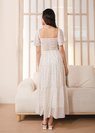 *Features a tier babydoll maxi dress designed with flutter sleeves, lace trimming details on the bust with tie string ribbons in the middle, pleated details down, a smocked back, concealed back zipper and functional side pockets