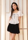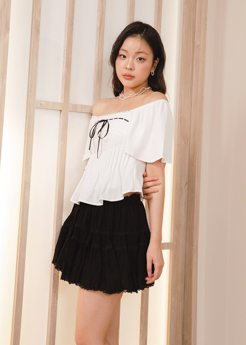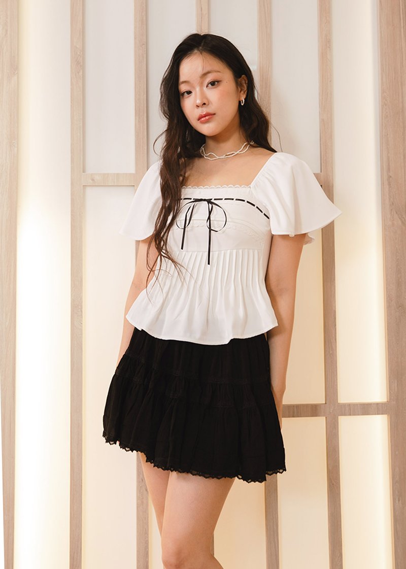 *Features a peplum flare fit with flutter sleeves this round, lace trimming details on the bust with tie string ribbons in the middle, pleated details down, a smocked back and concealed side zipper