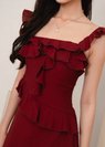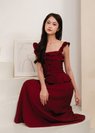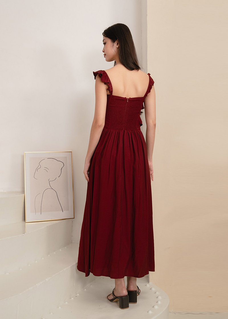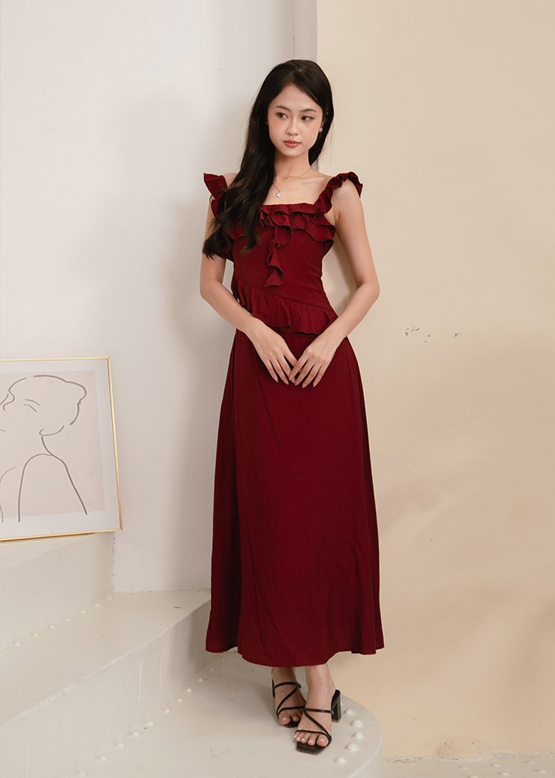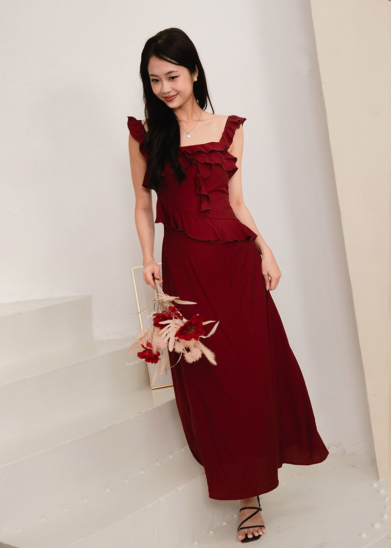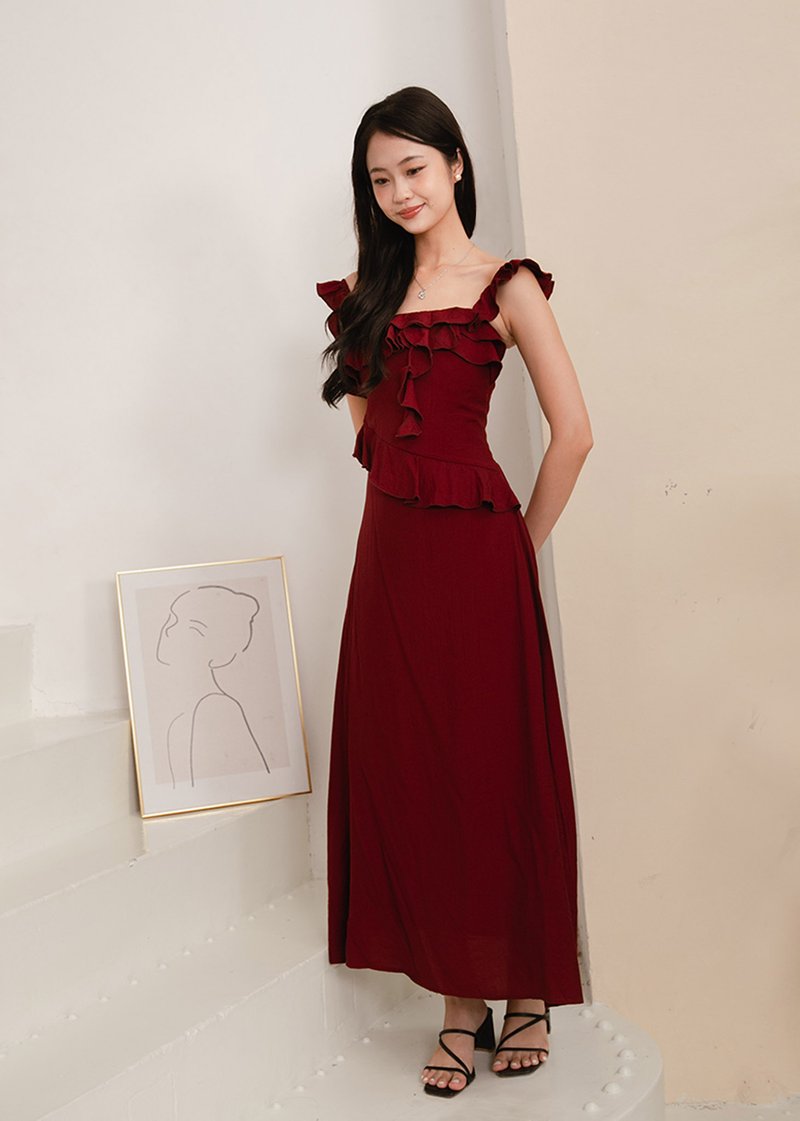 *Features a full length maxi dress with cascading ruffles details throughout on the bust area, a ruffles sleeves, comes with full smocked back with concealed back zipper