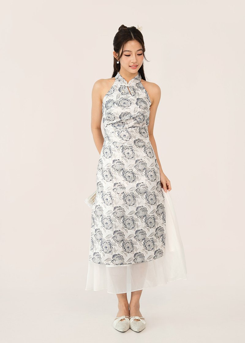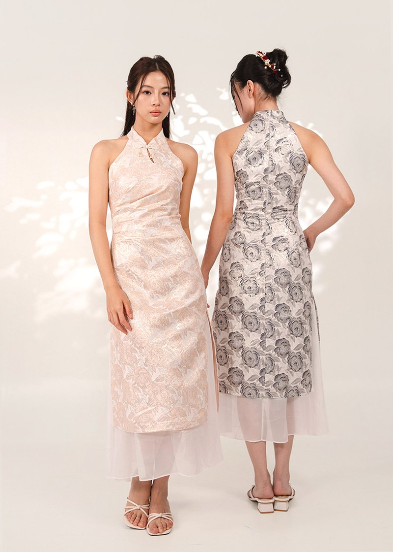 A masterful blend of tradition and modernity, 禧 (Xǐ–Happiness) features a lace-ribboned neckline adorned with glimmering floral embroidery. While embellished mesh pankou buttons echo the hem, completing a modern yet harmonious take on the traditional qipao.