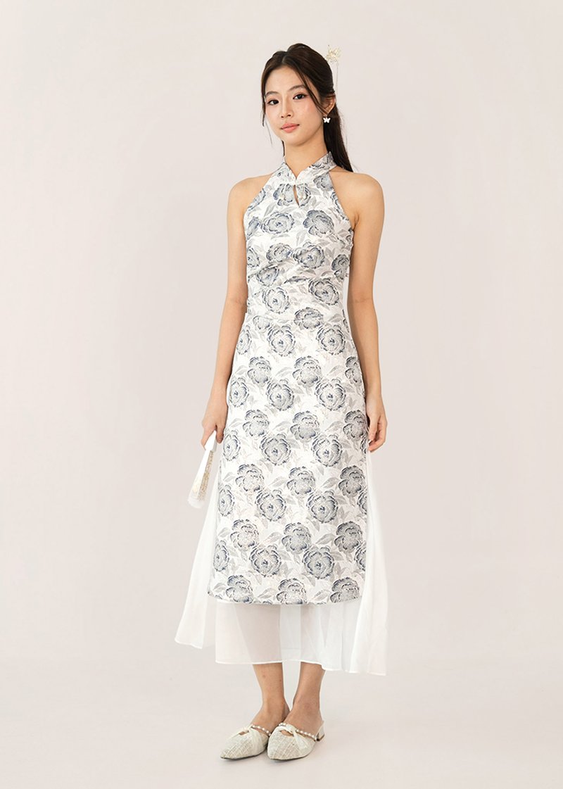 禧 (Xǐ–Happiness) Mesh Qipao Midi Dress in Imperial Blue