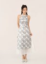*Features a qipao neckline designed with lace ribbons with sparkling floral embroidery prints throughout, slits on both sides with a subtle layer of mesh at the hem, and concealed back zipper