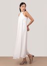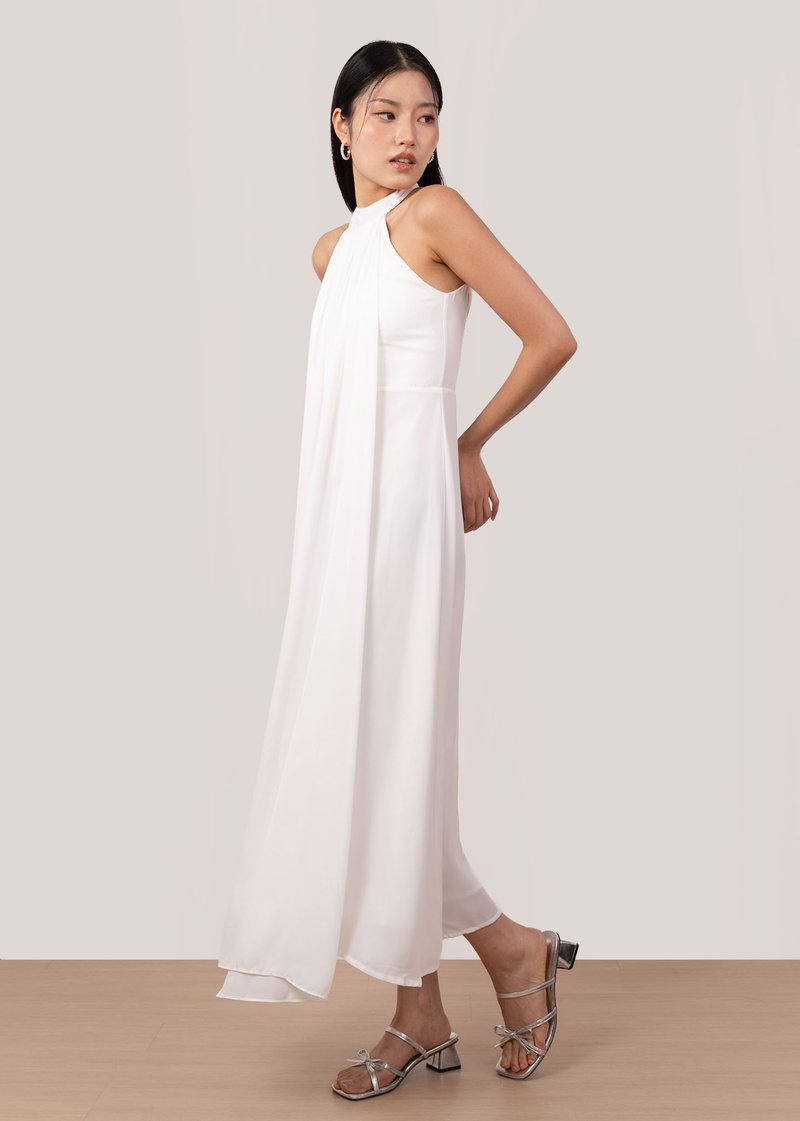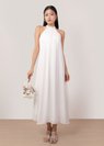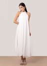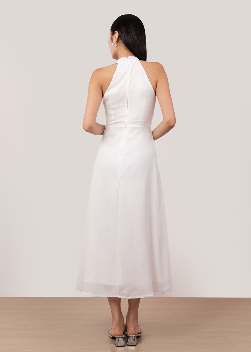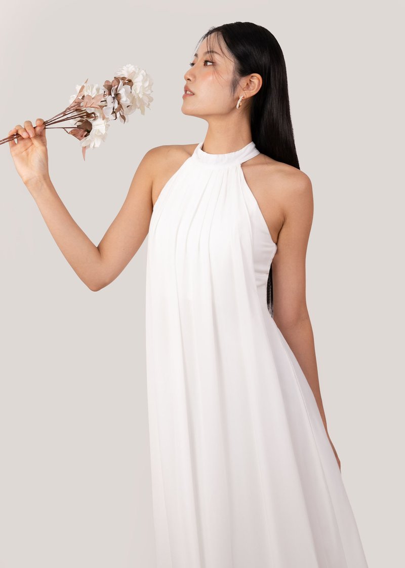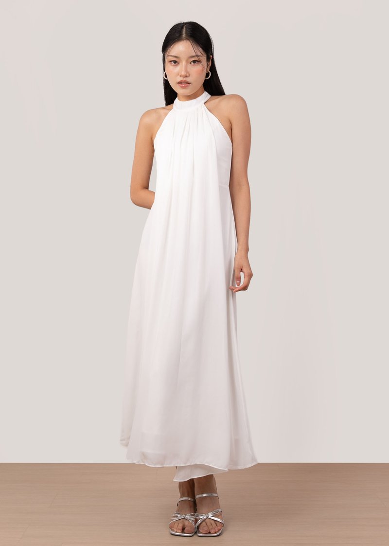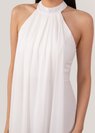 *Features a maxi length, a halter neckline and an additional lightweight pleated fabric on the front with a concealed back zipper