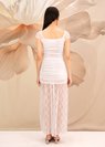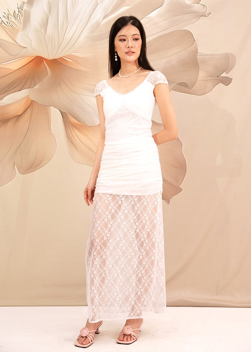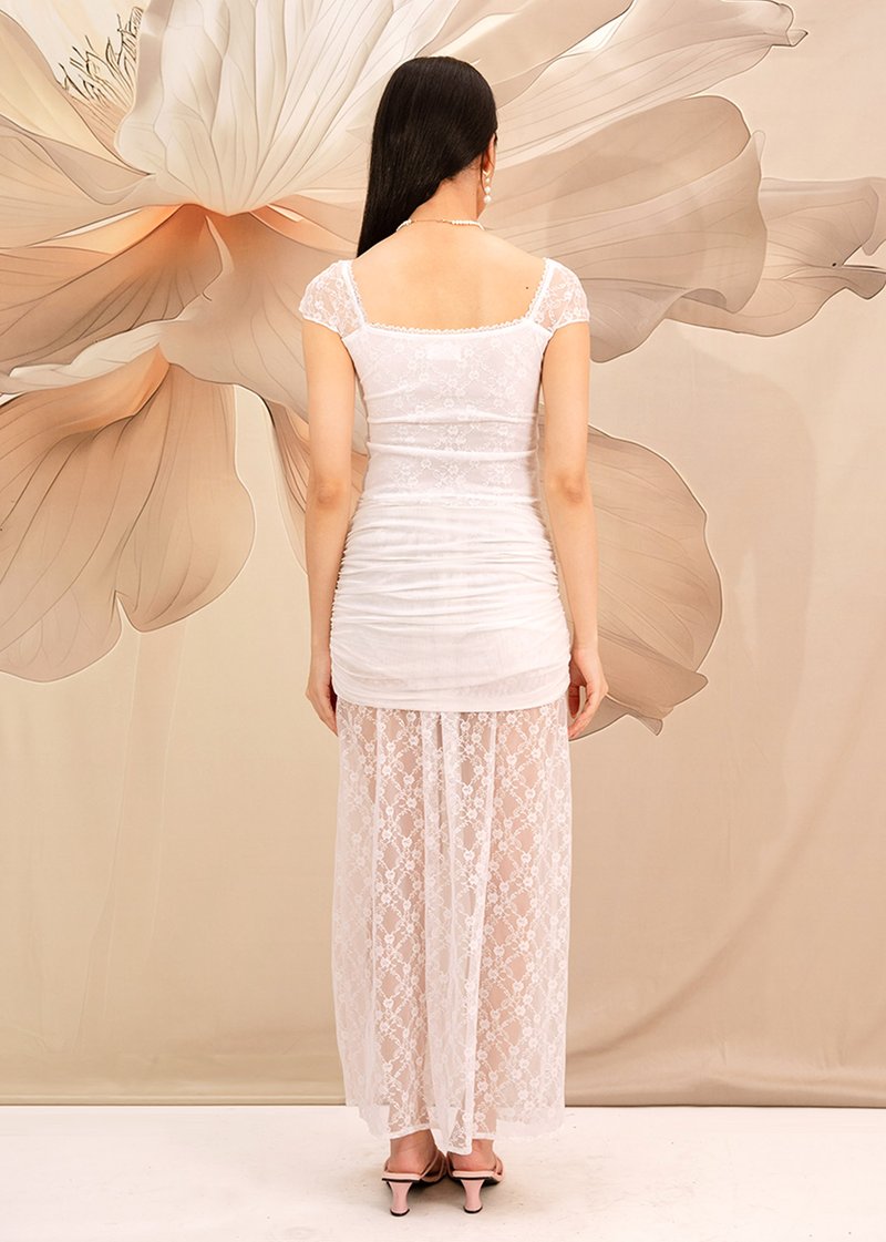 *Features ruching around the skirt connected to lace details on the bottom half of the skirt with a concealed side zipper