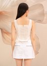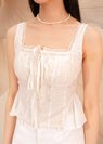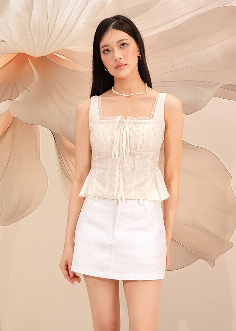 *Features a square neckline with floral embroidery on the design, functional tie string in front, non functional buttons down, a mesh peplum sides and exposed back zipper