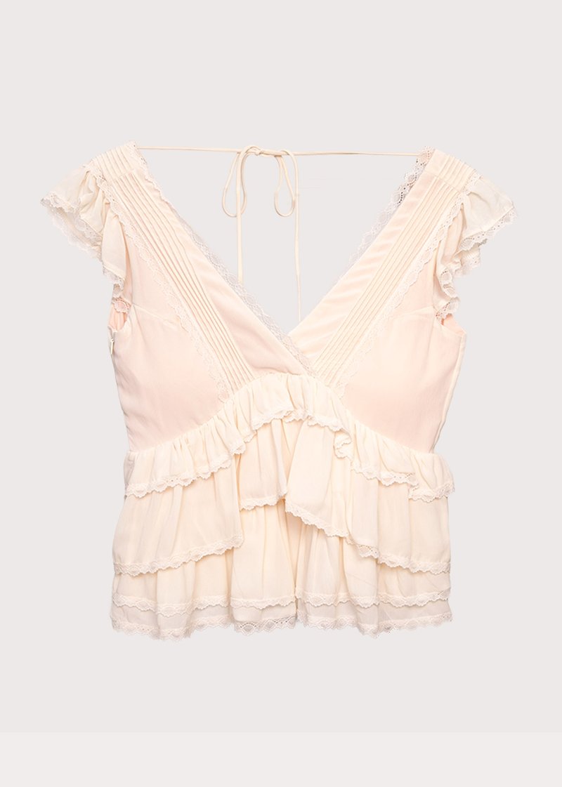 *Features a deep V neckline with lace trimming with ruffles and pleated details all over the top, a subtle flutter sleeves, a tie string at the back of the top and concealed side zipper